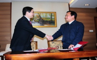 2013年12月,刘龙斌董事长与崂山区委副书记、区长杨鹏鸣签约现场。