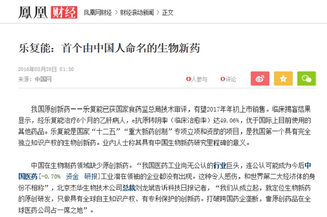 查看原文请点击:凤凰财经:乐复能:首个由中国人命名的生物新药