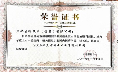 2019年1月12日,由中国医药生物技术协会和《中国医药生物技术》杂志共同主办的“2018年中国医药生物技术十大进展”评选活动揭晓,杰华生物“重组细胞因子基因衍生蛋白注射液(商品名:乐复能®)获批上市”入选。